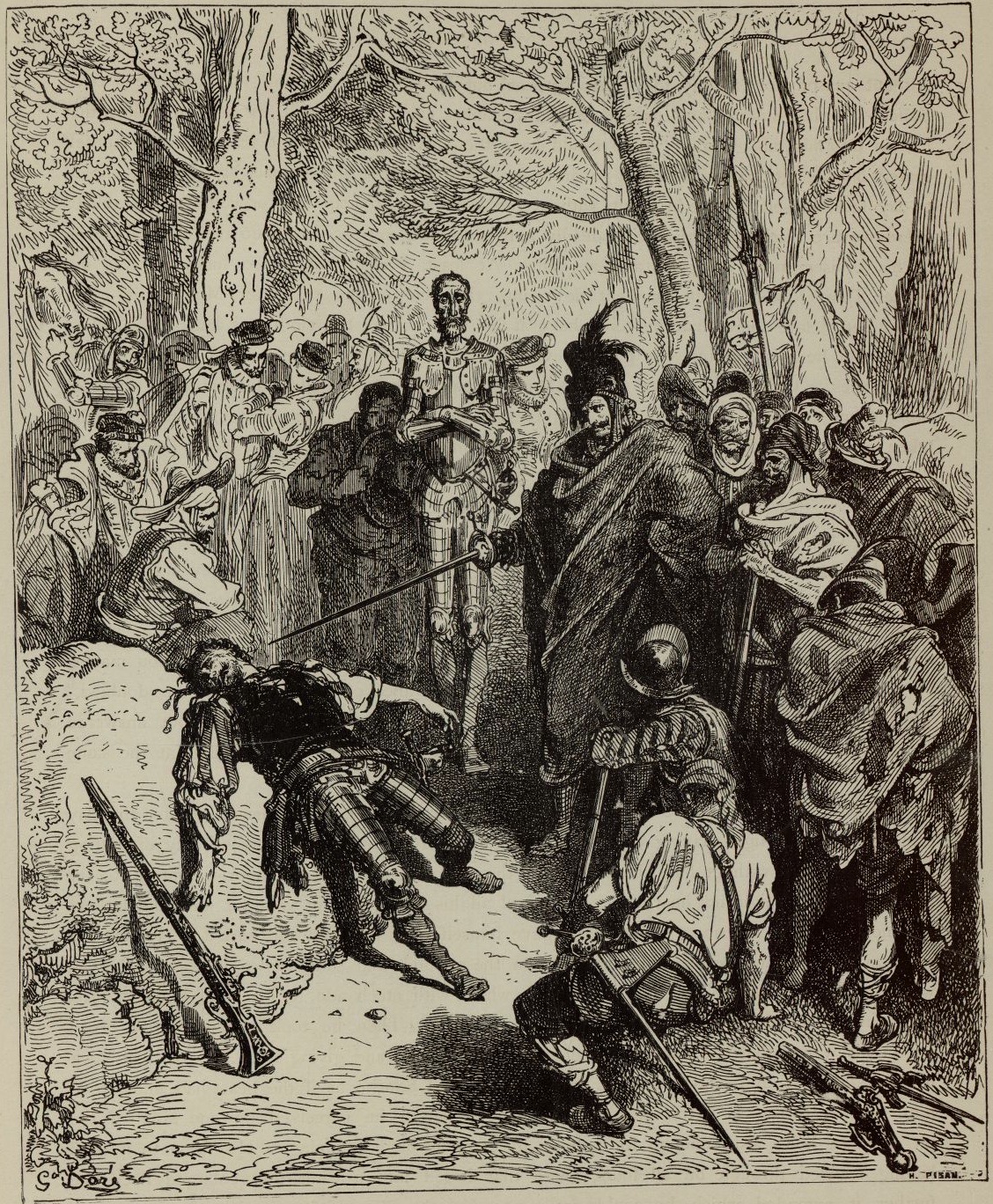 Roque Guinart overhears one of his bandits saying that their captain is more a friar than a bandit. Roque, drawing his sword, splits his head almost in two. He tells the other bandits that this is how he punishes insolent men who talk too much. Don Quixote and Sancho Panza look on. Signed by G. Doré (illustrator) and H.-J. Pisan (engraver). Part 2, ch. 60.