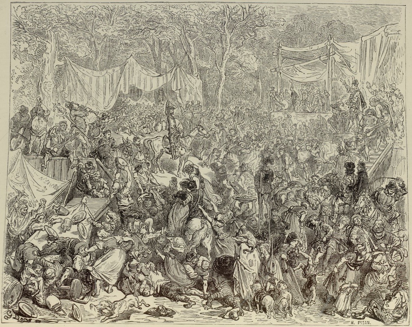 Don Quixote and Sancho Panza arrive at Camacho’s wedding. They appear at the centre of the composition, surrounded by cooks, musicians, dancers, children, and beggars. In Cervantes’ text, he describes an entire steer on a roasting spit, cauldrons large enough to hold the contents of entire slaughterhouses, dozens of wineskins, mounds of snowy white loaves of bread; in short, provisions so abundant they could feed an army. Signed by G. Doré (illustrator) and H.-J. Pisan (engraver). Part 2, ch. 20.