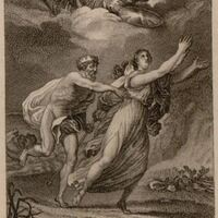 This image depicts the sea-God Neptune chasing a woman named Coronis. When walking along the sea shore, Neptune saw Coronis and became infatuated with her. He came from the water and began to chase her. The feeling was unrequited on Coronis’ part, and she cried out for help. The virgin goddess Minerva was sympathetic to the virgin woman Coronis and helped her plea. She helped her by transforming her into a crow so that she could fly away from Neptune. Minerva, depicted with her helmet, shield, and spear, is illustrated floating above Coronis in a bed of clouds as she reaches down to help her. Similarly, Coronis’ arms are reaching up towards Minerva.