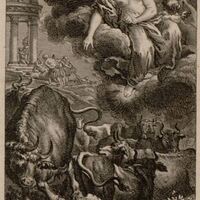 This image depicts the transformation of the Cerastae of Cyprus. The Cerastae of Cyprus had been failing to worship the god Jupiter properly by sacrificing people who visited their city. The temple to Jupiter is depicted in the background of the image where people are being sacrificed. Venus was angered by these forms of sacrifices and punished the Cerastae by transforming them into bulls. Venus is depicted floating on a bed of clouds at the top of the image while the transformed bulls are below her.