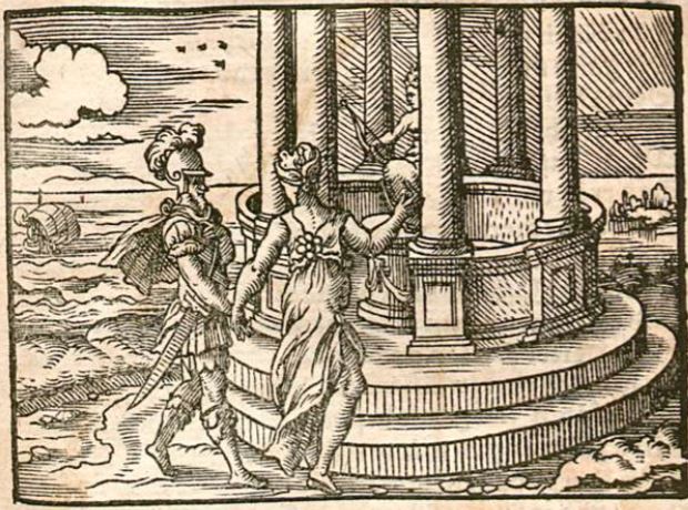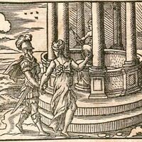 This engraving illustrates Medea, the daughter of King Aeetes, holding hands with Jason, the leader of the Argonauts. They are standing in front of an altar dedicated to Hecate. Jason is on a mission to retrieve the Golden Fleece, which King Aeetes currently has. King Aeetes has given Jason a challenge to complete in order to receive the Golden Fleece from him. Medea is completely infatuated with Jason and decides that she will betray her father in order to help him. In return for Medea’s assistance, Jason promises to marry her.