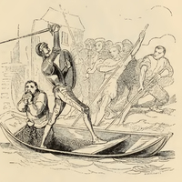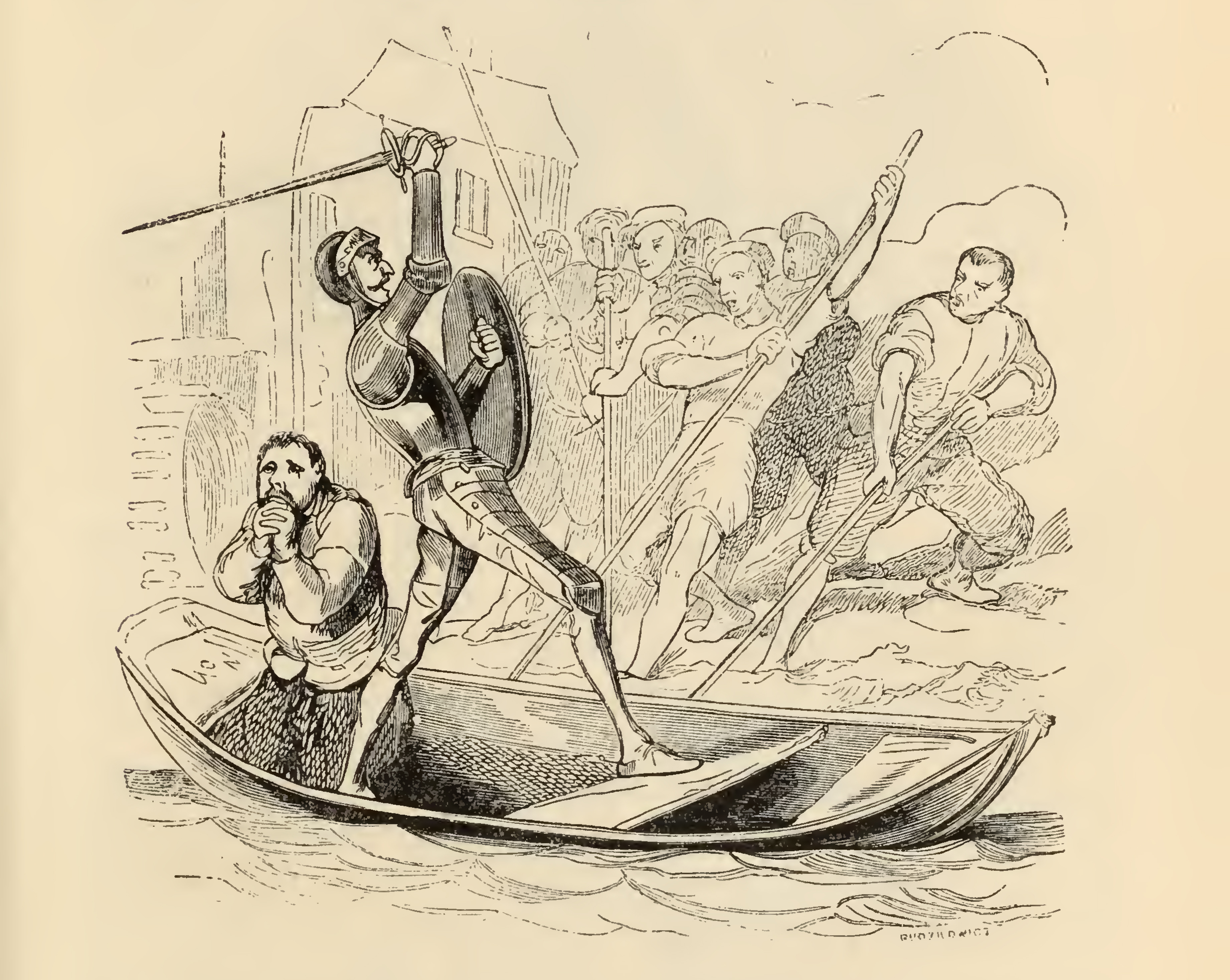 Having set downstream on a small fishing boat, Don Quixote (middle) and Sancho Panza are headed directly into the churning wheels of a mill. Seeking to stop the collision, millers gather by the bank to tip the boat. In response, Don Quixote, clad in armor, with his shield by his chest, grasps at his sword and fences with it in the air against the millers; who set themselves with their poles to stop the boat. Sancho falls upon his knees, and prayed to heaven devoutly to deliver him from the perilous situation.