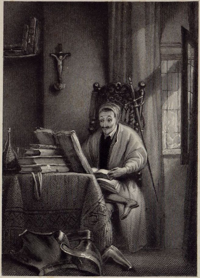 - Alonso Quijana reads chivalric books in his library, slowly descending into madness. His arms and armour are strewn about on the floor. Signed by S. Sangster (engraver). Part 1, ch. 1.