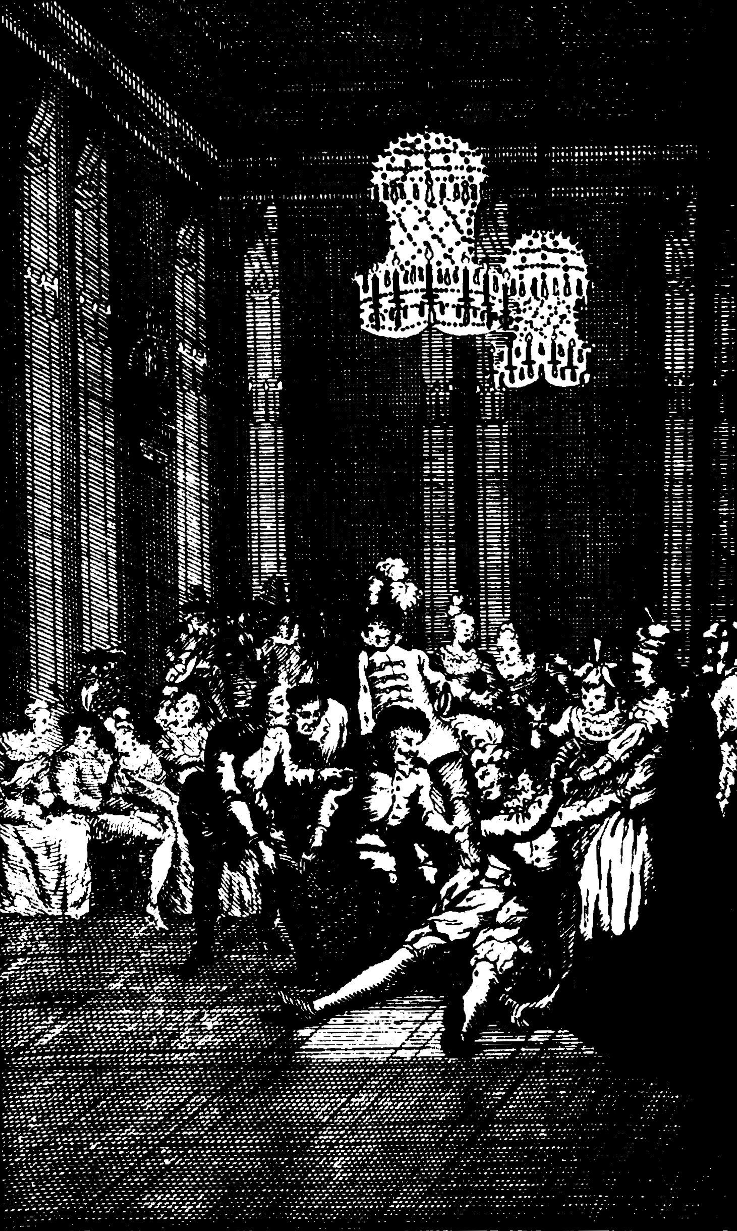 In the house of Don Antonio, his wife had invited many of her friends to a ball to honor their guest Don Quixote. The dancing began at ten o'clock at night, and two of the women present at the ball made their entertainment by dancing with Quixote one after the other until he could not longer stand, both his body and soul having been exhausted. Antonio (pictured to the left of Sancho Panza) gave order that Quixote should be carried to bed, and the first to lend a hand was Sancho Panza (pictured to the left of Quixote).