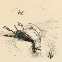 The body of a dead sparrow lies upon the ground, its head hanging over a ledge, its feet loft and poised, wings folded by its side. In the background a bird flies in the sky. The image is evoked by Don Quixote saying "Verily, verily, a sparrow in the hand is better than a vulture upon the wing".