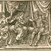 This engraving illustrates Ino and King Athamas sitting on their thrones while ruling over Thebes. One out of the three Furies, Tisiphone, is depicted on the left side of the illustration with snakes in her hair and a blood-soaked torch in her right hand. Her left hand is lifted above Ino and Athamas as she pours poisonous liquids over them. These liquids poison their minds and makes them crazy. Tisiphone was sent to do this by the vengeful goddess Juno.