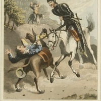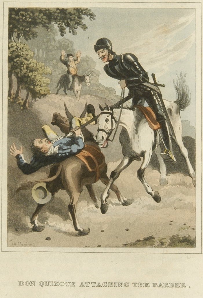 - Mistaking a basin for what he believes to Mambrino’s legendary helmet, Don Quixote attacks the barber, who falls from his mount. In the background, Sancho throws up his arms. Unsigned. Part 1, ch. 3.