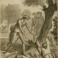 After the adventure of the enchanted boat on the river Ebro, Don Quixote helps Sancho Panza out of the water. Some millers are also pictured (right). The illustration is inaccurate to the text; Cervantes writes that Don Quixote and Sancho Panza are pulled to land by the millers, rescuing them from the millrace rapids of the Ebro. Signed by J.-J.-F. Le Barbier (illustrator) and L.-M. Halbou (engraver). Part 2, ch. 29.
