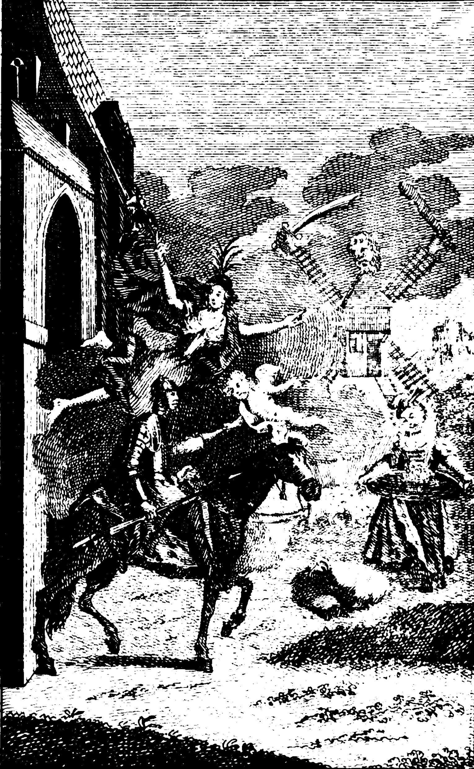Don Quixote sets off in secret to begin his chivalrous journey. This image portrays the scene as Don Quixote might have envisioned it, for the windmill in the background is armed with a sword and club, while also having the head of a giant. Moreover, the woman flying next to him and the cherub is likely Dulcinea Del Toboso, the woman for whom he has given the soverignty of his heart while the woman curtsying by the fence is Aldonsa Lorenzo, the woman who Dulcinea Del Toboso is based on.