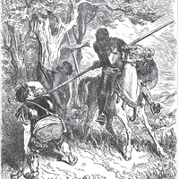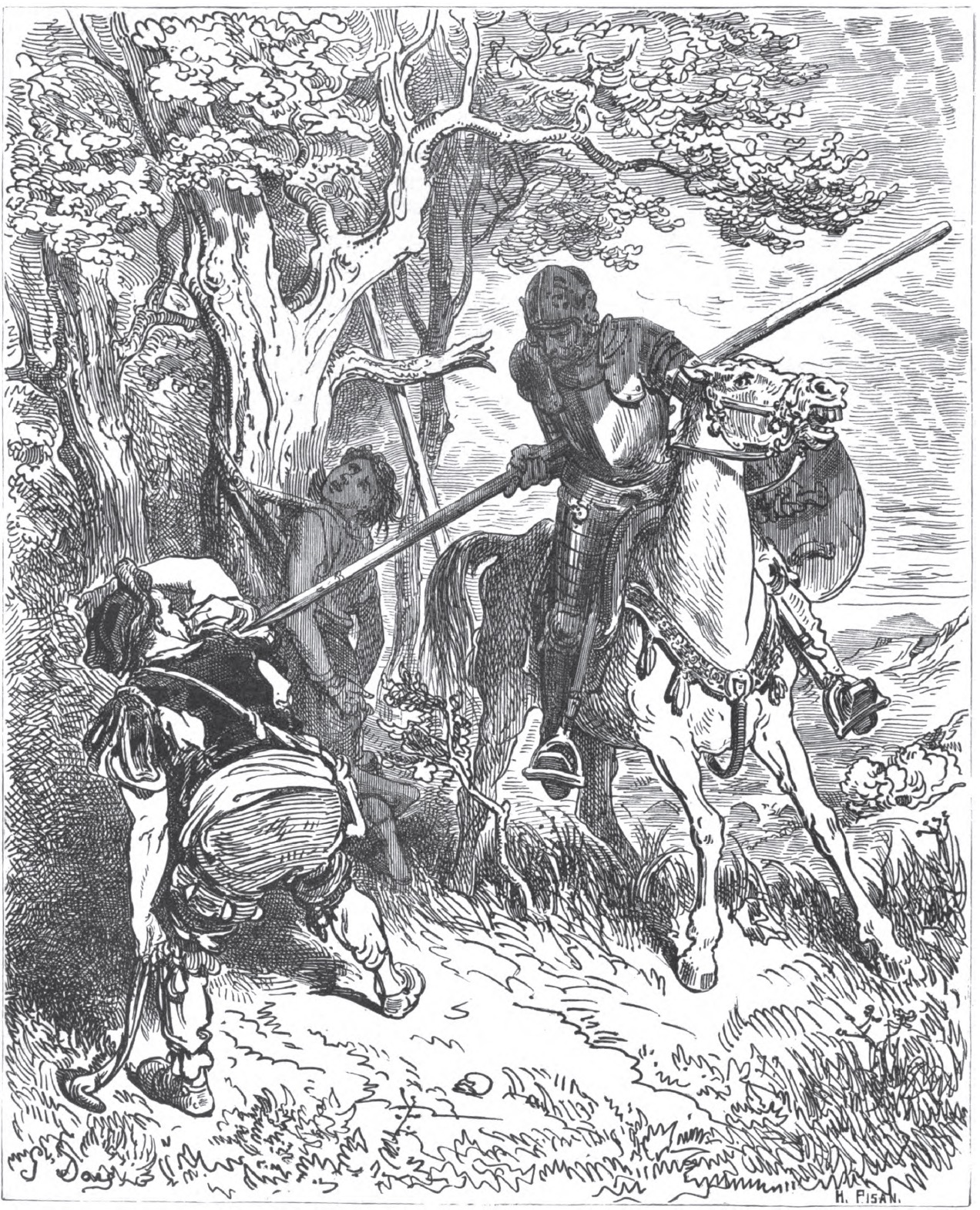 Don Quixote attempts to rescue a young boy being beaten by his master. He threatens to run the farmer through with his lance if the farmer does not let the boy go and pay him his full wages. This scene can be found in Part I, Book 1, Chapter 4.