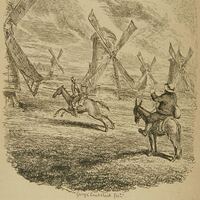 - Don Quixote, mounted on Rocinante, charges the windmills, which he mistakes for giants. Sancho Panza tries to warn him in vain. Signed by G. Cruikshank (illustrator and engraver). Part 1, ch. 8.