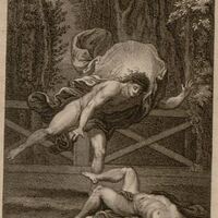 This image depicts the love story and tragedy of the god Apollo and his lover Hyacinthus. The two would often engage in physical activities together, and one day they decided to have a disc throwing contest. Apollo threw the discus, which cut through the heavens and the skies. As it was falling back to Earth, Hyacinthus wanted to impress Apollo by catching it, however, he got too close as it hit the ground. When the discus rebounded off the ground, it fatally hit Hyacinthus in the head. Apollo is running over to his lover who is lying dead on the ground. In order to be with Hyacinthus forever, he transforms him into the Hyacinth flower, which blooms every year.