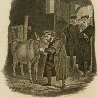 In the stable, Sancho Panza reunites with his donkey and embraces it before leaving Barataria Island. From the door, the secretary, the steward, the majordomo, and Pedro Recio observe him. The engraving is well detailed, especially the figure of the donkey. Signed by A. V. Sixdeniers (engraver). Part 2, ch. 53.