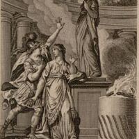 This image depicts Medea, the daughter of King Aeetes, looking passionately at Jason, the leader of the Argonauts. Jason is on a mission to retrieve the Golden Fleece, which King Aeetes currently has. King Aeetes has given Jason a challenge to complete in order to receive the Golden Fleece from him. Medea is completely infatuated with Jason and decides that she will betray her father in order to help him. In return for Medea’s assistance, Jason promises to marry her. Jason and Medea are depicted standing at a temple dedicated to Hecate. There is a large statue of Hecate in this image with a burning fire directly beside it.