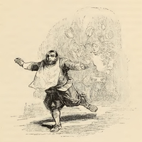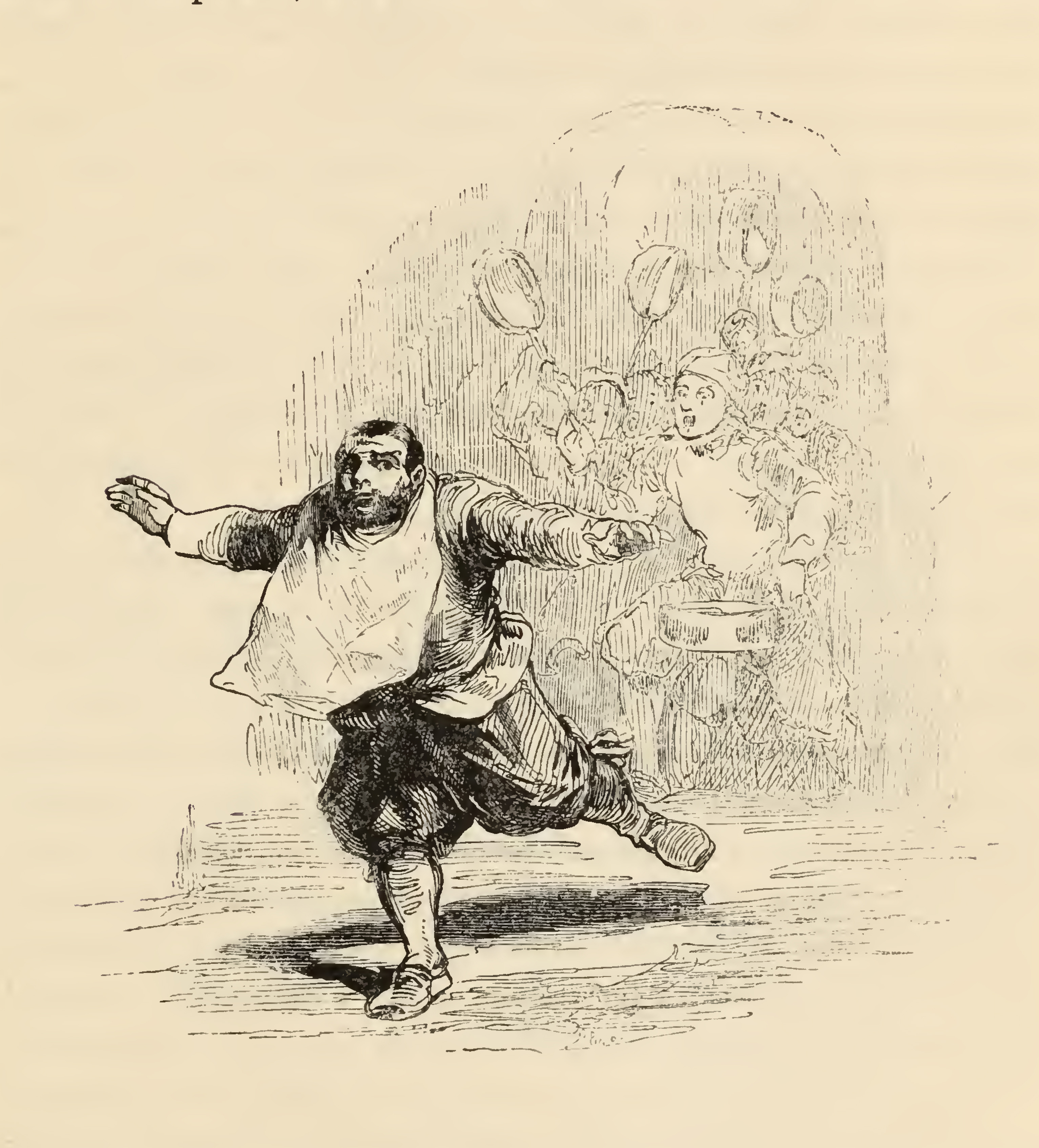 Sancho rushed into the hall in a sprint, eyes filled with fear and arms stretched out like wings in flight, with a dish-clout pinned round his neck instead of a napkin. He is followed by a gaggle of kitchen-boys and scullions, one of them carrying a tray full of water, and the rest of them raising their pots like pitchforks.