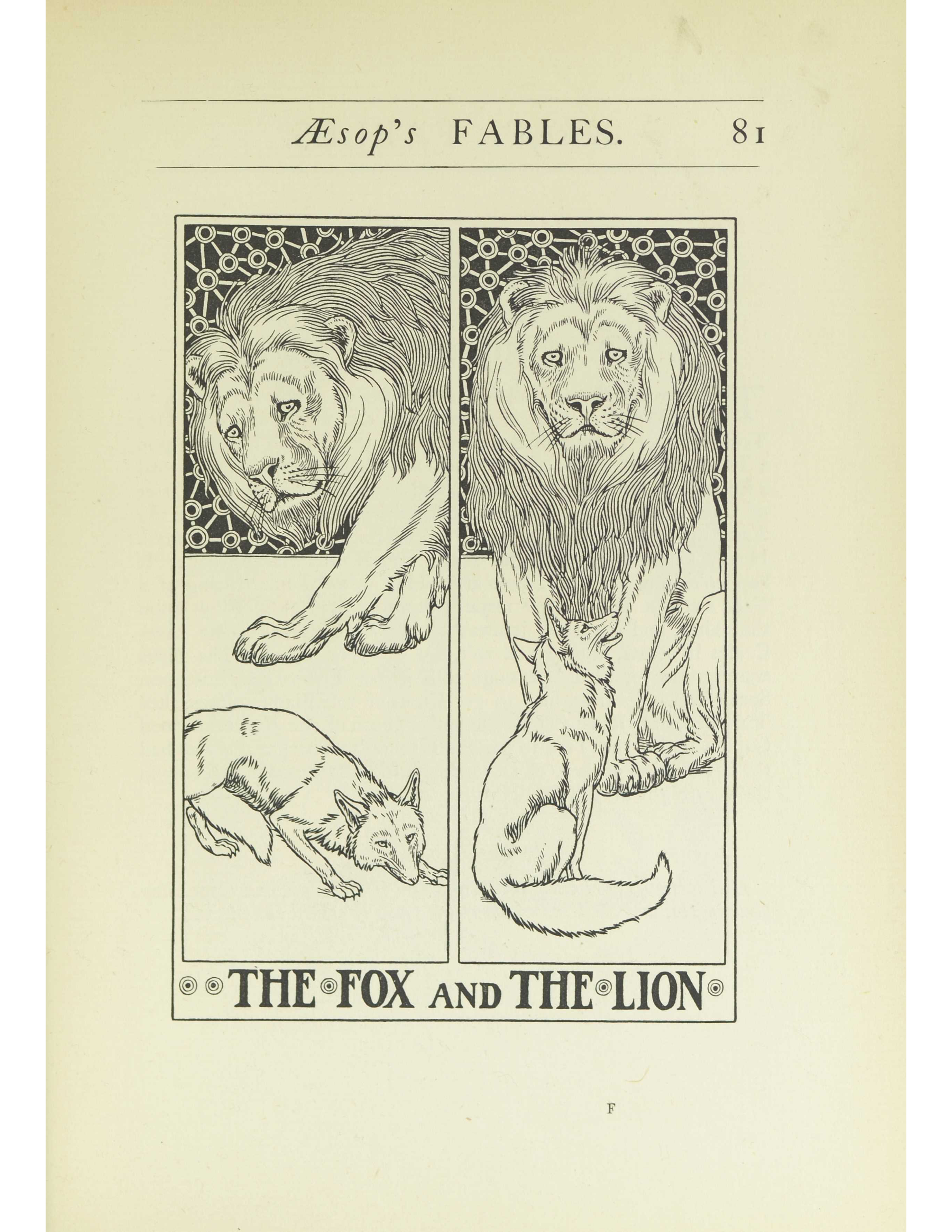 - On the left, a fox is crouched in the forefront with its tail between its legs with a lion lurking in the back examining the fox. On the right, the fox is seated and looking up at the lion. The lion is seated facing the fox but is looking forward.