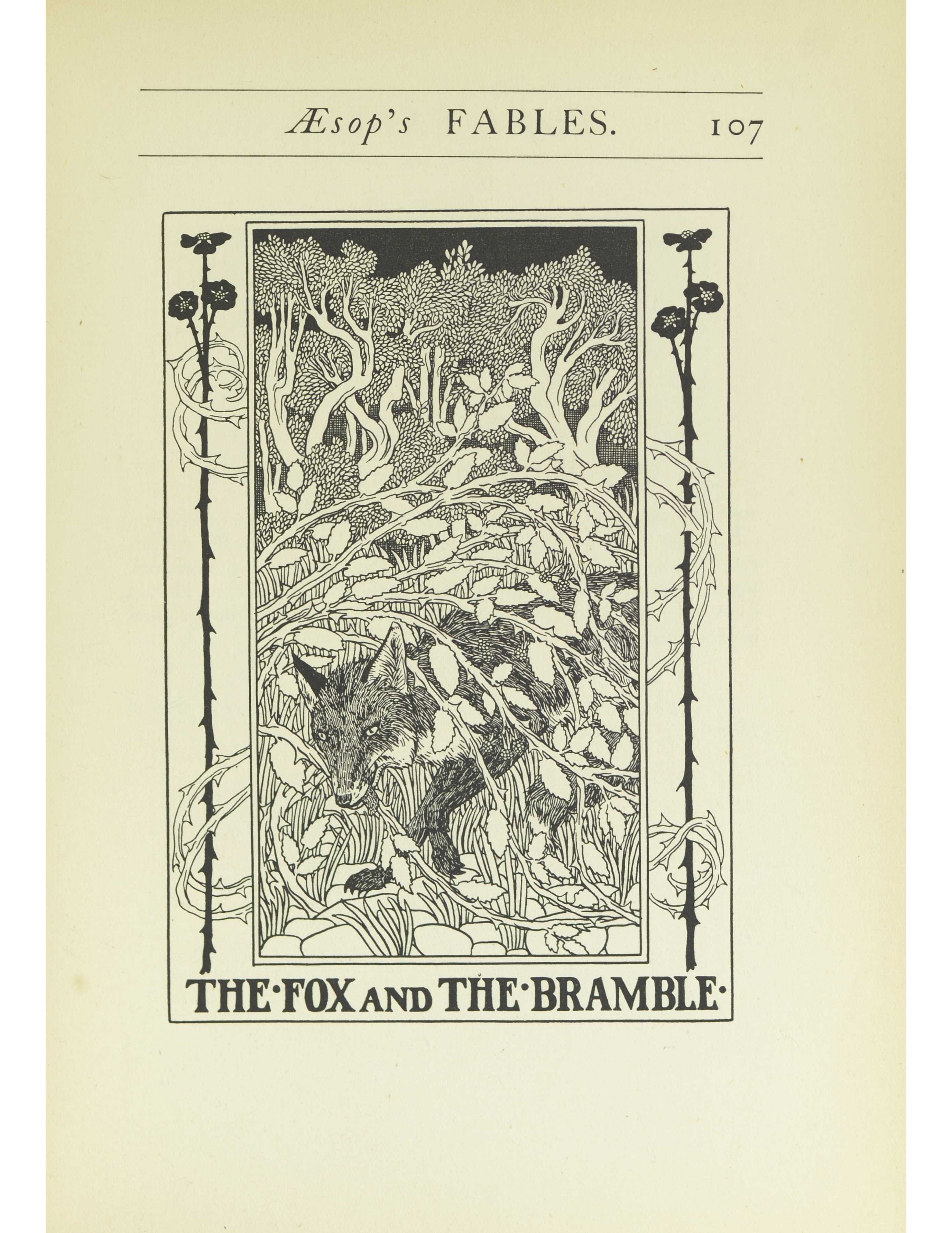 - In the forest, a fox is entwined in the bramble branches which have many thorns, with his tongue sticking out of his mouth.