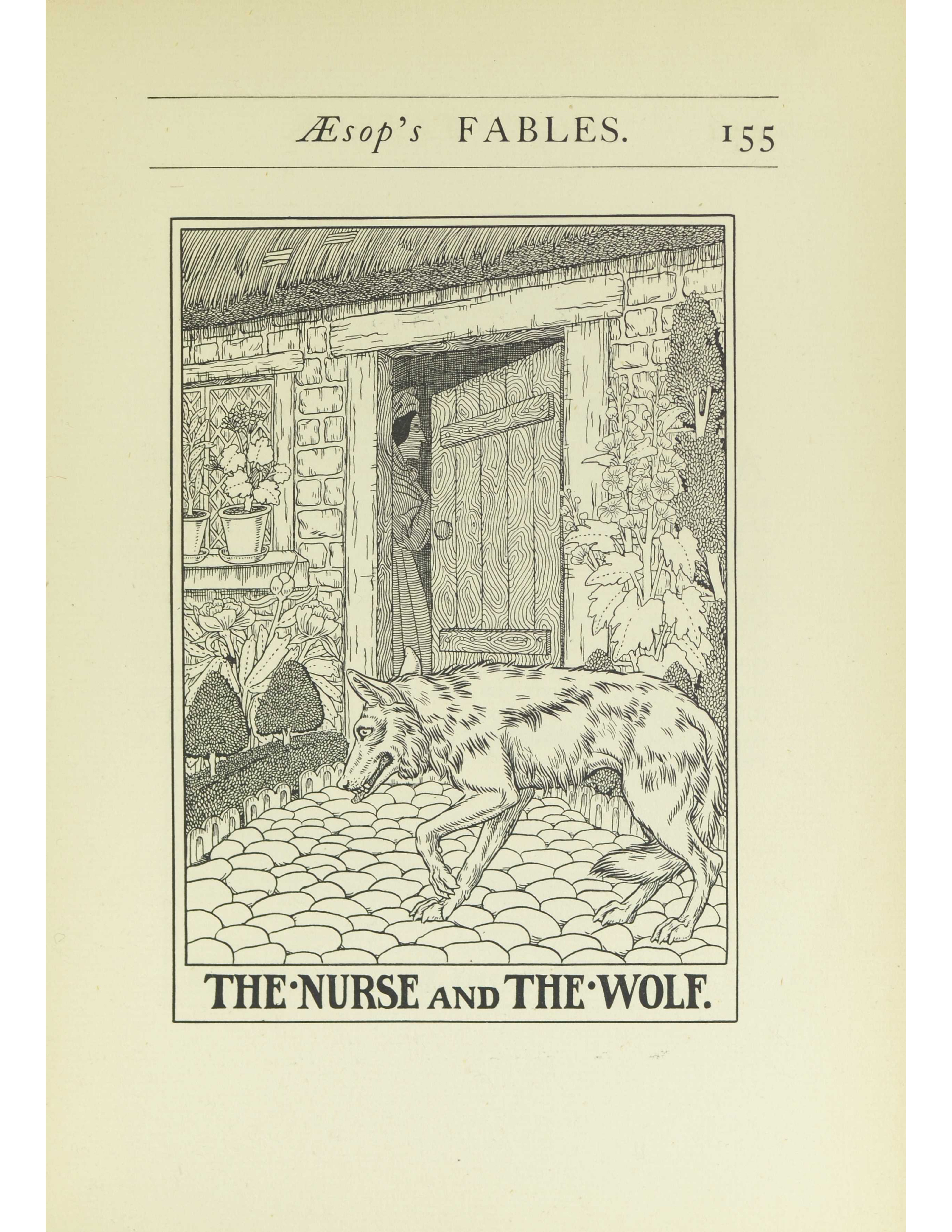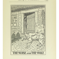 There is a house with the front door open and a nurse standing in the doorway looking out at a wolf. On the front walkway the wolf is standing on three legs and the fourth one raised, his tail is between his legs. The walkway is made of stone, on the left side of walkway has hedges. The roof of house is made with straw, the front door made of wood. The window ledge has potted plants. The nurse has dark hair dressed in a gown.