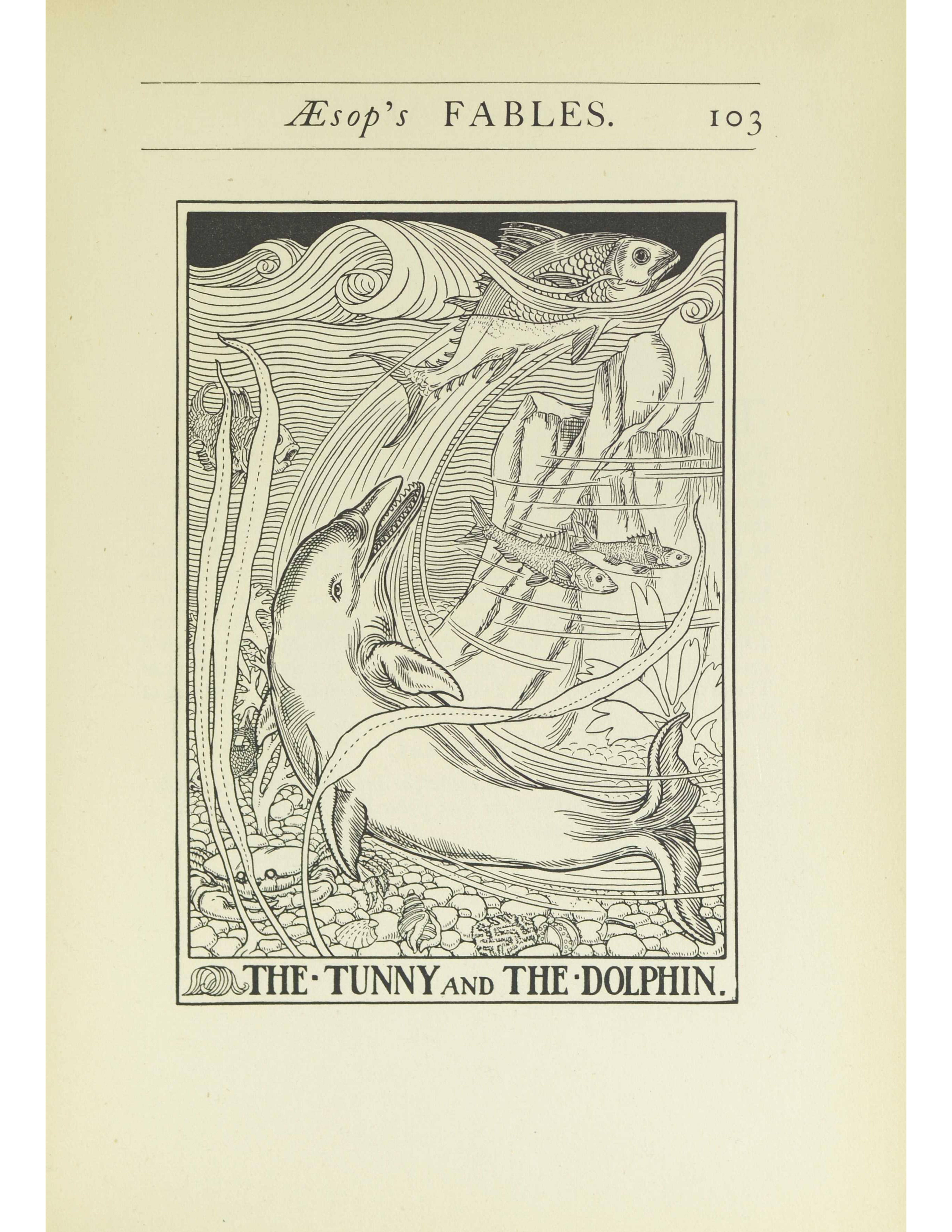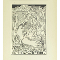 - A smiling dolphin is chasing a concerned looking tuna in the ocean. The other fish are just swimming along and not paying attention to the dolphin or the tuna.