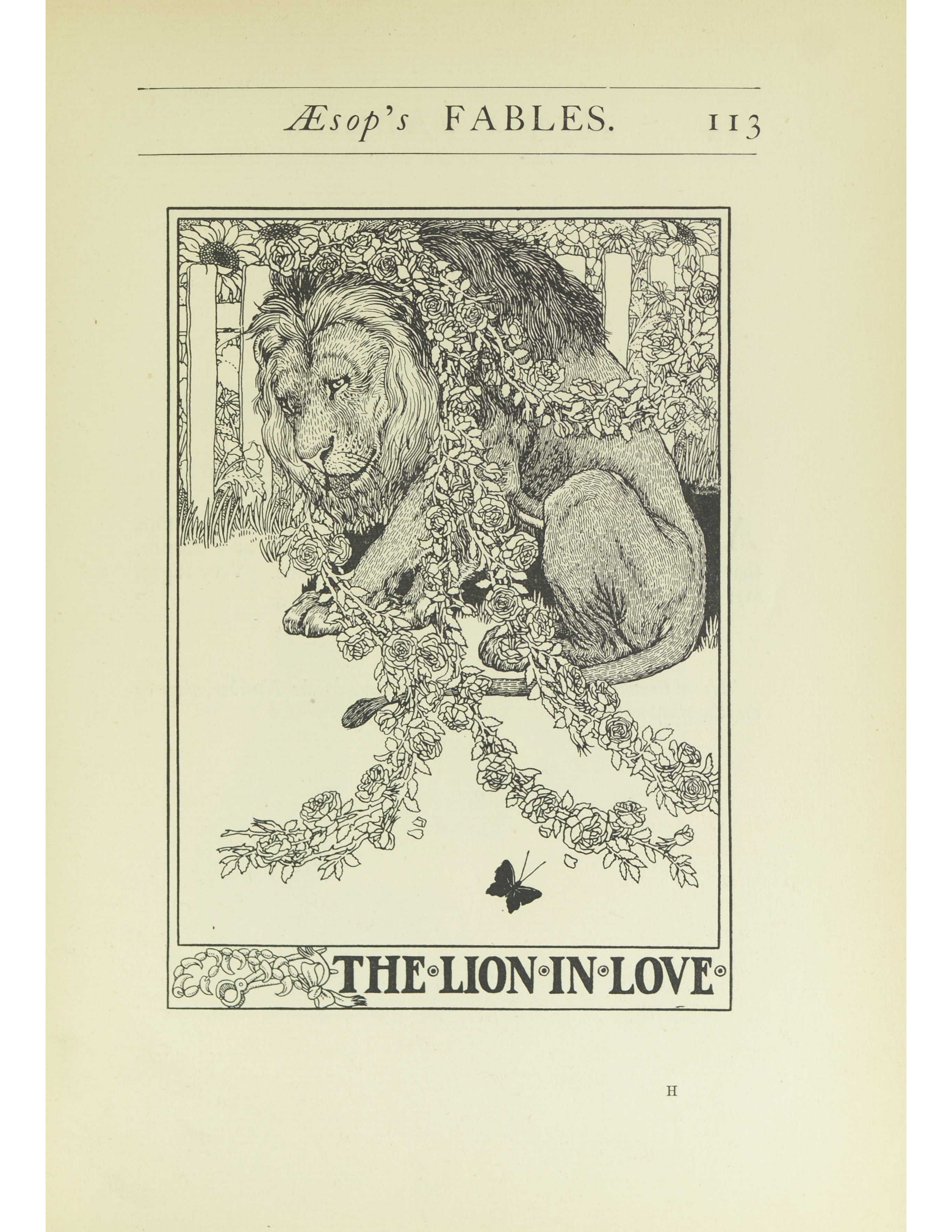 - A lion sitting in front of a fenced in sunflower garden covered in a garland of roses.