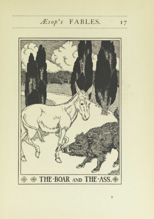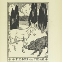 - An donkey/ass and a boar side-by side. The boar's face is at the donkey's ankles. They stand in a pathway.