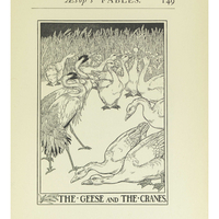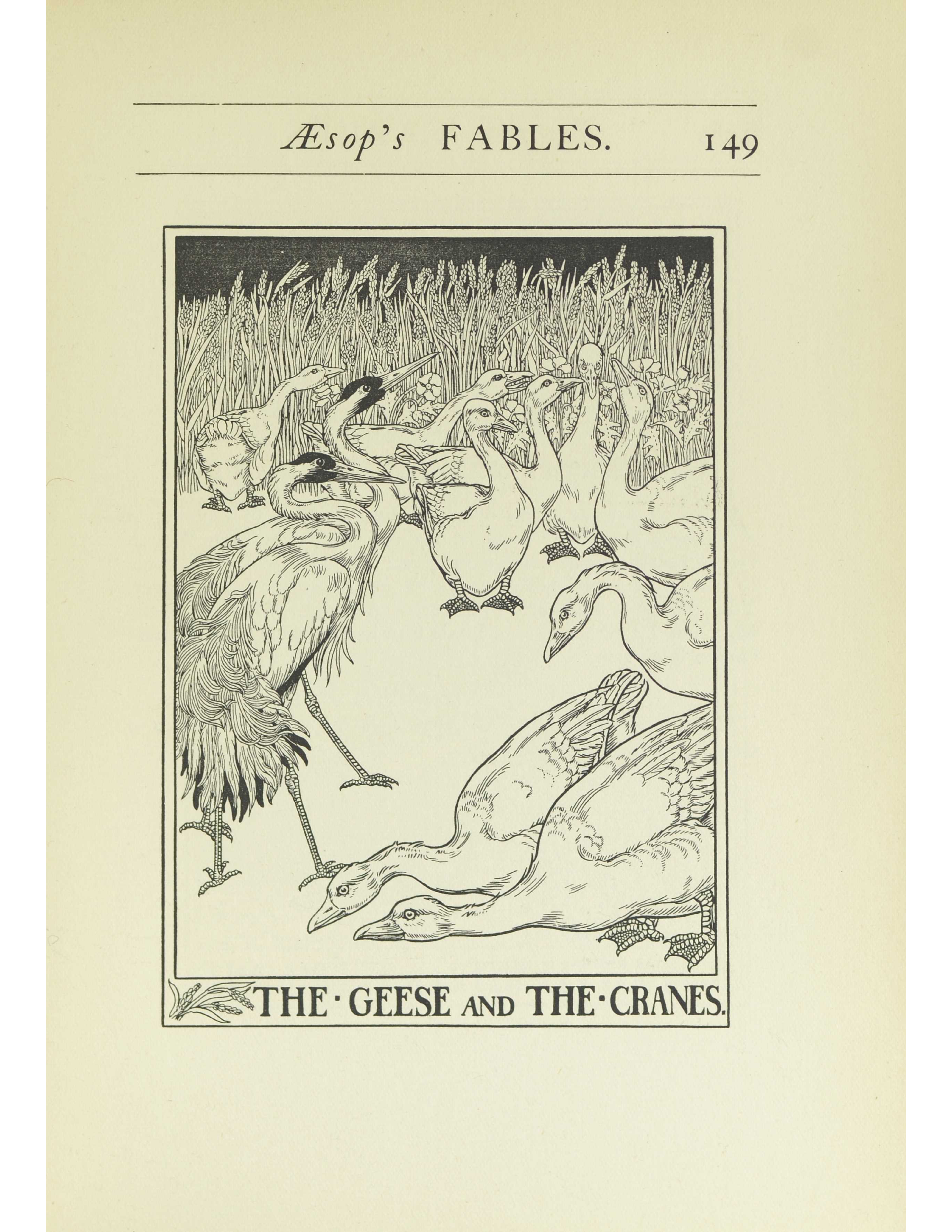 In the centre at the left side there are two cranes. The very top of picture there is wheat growing, in front of the wheat there are six geese between the cranes and where the wheat begins. To the right of the cranes there is one goose and at the bottom right hand there are two geese that have their heads close to the ground. The total amount of geese is nine.