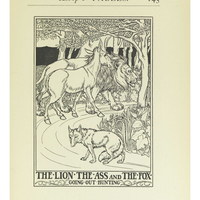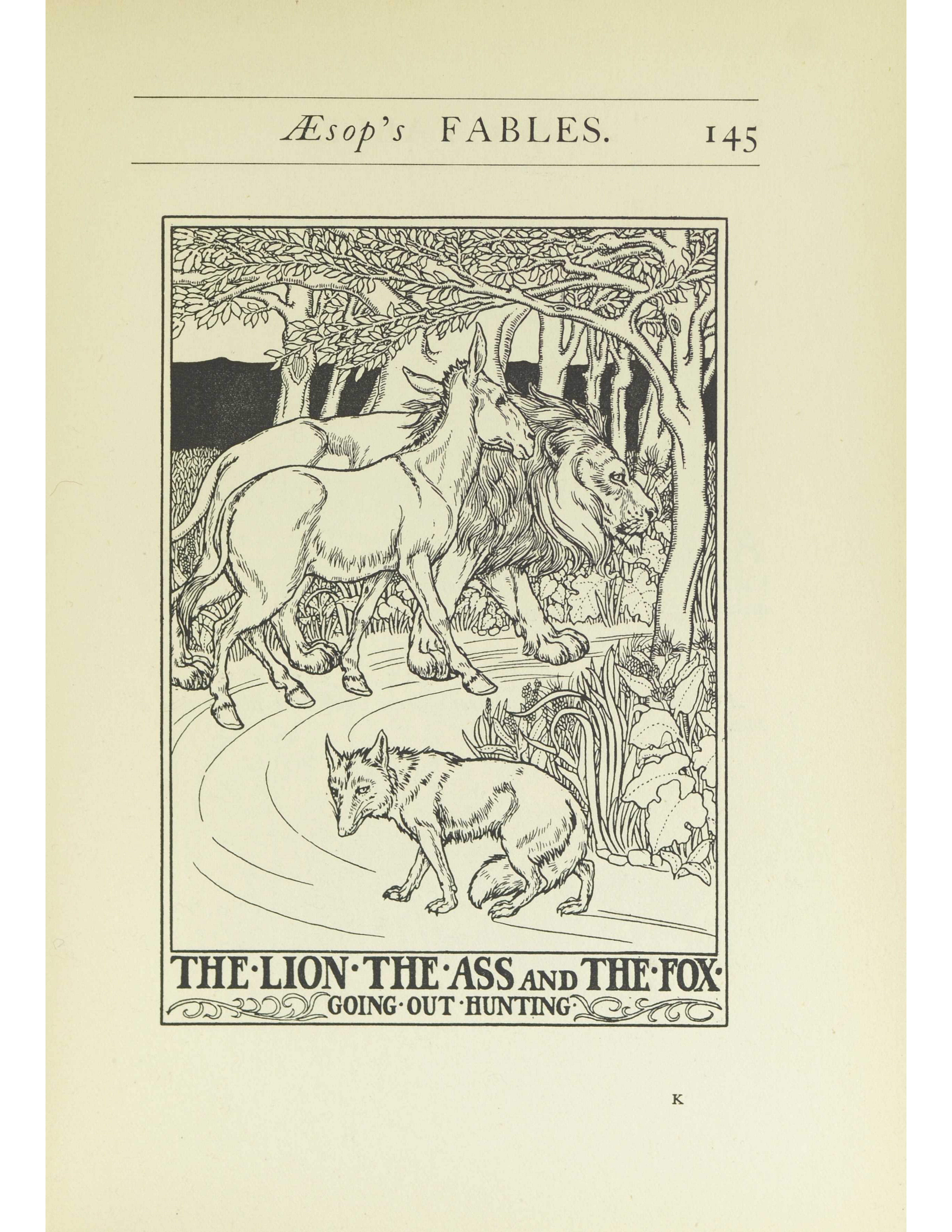 There is a lion and a donkey walking side by side on a trail through the woods. The trees are at the top of the page with a path that the animals are walking on. To the bottom right there is a fox that is looking behind him on the trail following the lion and donkey. There are wildflowers growing on both sides of the trail.