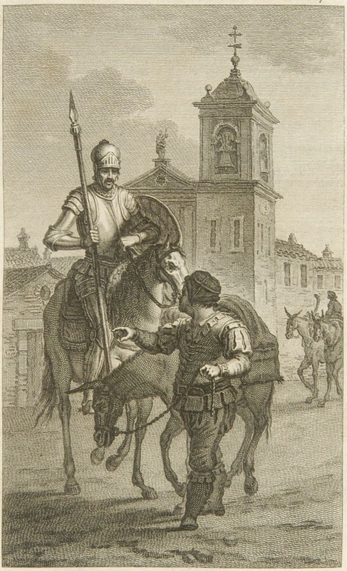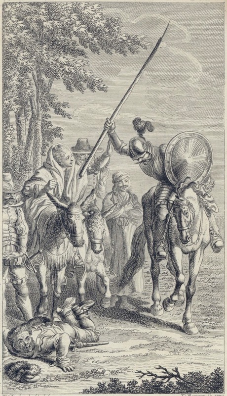 This plate depicts three scenes in ch. 8. In the background, Don Quixote charges the windmills, which he mistakes for giants, while Sancho Panza tries to stop him. In the middle ground, the Benedictine friars’ servants beat Sancho on the road to Puerto Lápice. In the foreground, Don Quixote battles the Basque squire while the lady watches the fierce contest from the safety of her carriage. The illustration is not accurate to Cervantes’ text: the Basque is pictured holding a stool, while Cervantes writes that he defends himself from Don Quixote’s blows with a pillow. Unsigned. Part 1, ch. 8.