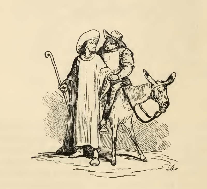 Master Peter, the puppet master with a patch covering his right eye departs from the inn with walking stick in his right hand. An ape is cradled in his left hand that wears a shirt and grasps tightly to Peter's chest. In the background on the left is a cart that carries fragments of his castelet having been destroyed by Quixote, and taking his ape, master Peter, who is Gines de Pasamonte in disguise, walks in quest of farther adventures.
