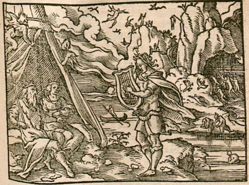 Pained by the death of his new bride, Orpheus was determined to get her back. With his lyre in hand, he travels to the Underworld to convince the lord of the Underworld and his wife, Proserpina, to let Eurydice finish living her life. Orpheus is illustrated in the center of the engraving, singing and playing his lyre to the lord and lady of the Underworld, who are sitting directly in front of him. Charon, the ferryman who carries the dead across the River Styx is illustrated in the background of the engraving in the water. Pluto and his wife were impressed with Orpheus and his lyre playing and singing abilities, and allows him to bring Eurydice back with him, so long as he does not look back to her while they travel out of the Underworld.