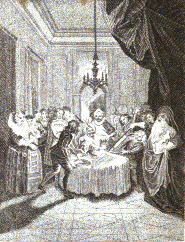 After finishing his work in the justice tribunal, Sancho is led to a sumptuous room where was placed an elegant and splendid table. Sancho sat down at the upper end of the table as there was but one chair and no other napkin or plates. On the far right, a physician dressed in black robes with a long white flowing beard and black spectacles, placed himself next to the table with a whalebone rod in his hand. Delicious food was brought forth to the table and a laced bib was placed under Sancho's chin. Sancho had scarcely had a bite of a fruit plate when the physician touched the dish with the wand, and a page took the plate away. Sancho was going to try another plate but before he could reach or taste it, the wand had touched it and another page whipped that away also with as much speed as they had done the fruit.