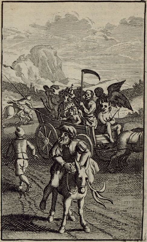 Don Quixote and Sancho Panza encounter a cart carrying the actors of Angulo el Malo’s company for the mystery play ‘The Assembly of Death.’ The latter are dressed as Devil, Cupid, Death, Angel, Emperor, Queen, and Soldier. Rocinante is alarmed by the sound of bells and runs across the field. While Sancho runs to Don Quixote’s assistance, a member of the company makes off with his donkey. Unsigned. Part 2, ch. 11.