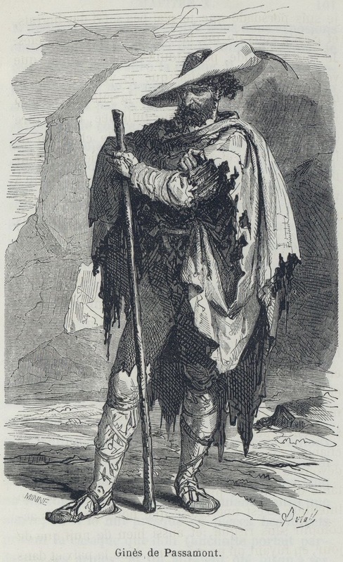 Portrait of Ginés de Pasamonte, an ungrateful galley slave that Don Quixote and Sancho Panza free in ch. 22. Signed by A. ‘Bertall’ d’Arnoux (illustrator) and Minne (engraver). Part 1, ch. 22.