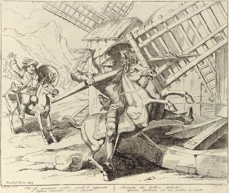 Don Quixote, mounted on Rocinante, charges a windmill that he mistakes for a giant despite Sancho Panza’s warning. The sail catches the wind, moving with so much force that it breaks his lance and picks up the horse and the knight. Signed by Bartolomeo Pinelli (engraver and illustrator) and dated Rome, 1833. Plate 13. Part 1, ch. 8.