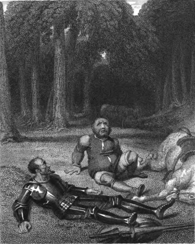 Don Quixote meets Roque Guinart after he and Sancho are surprised by the bandits. He explains that he was captured unarmed and that had found him on his horse, with his lance and his shield, it would not have been easy for them to defeat him. Signed by A. Rodríguez (illustrator) and B. Vázquez (engraver). Part 2, ch. 60.