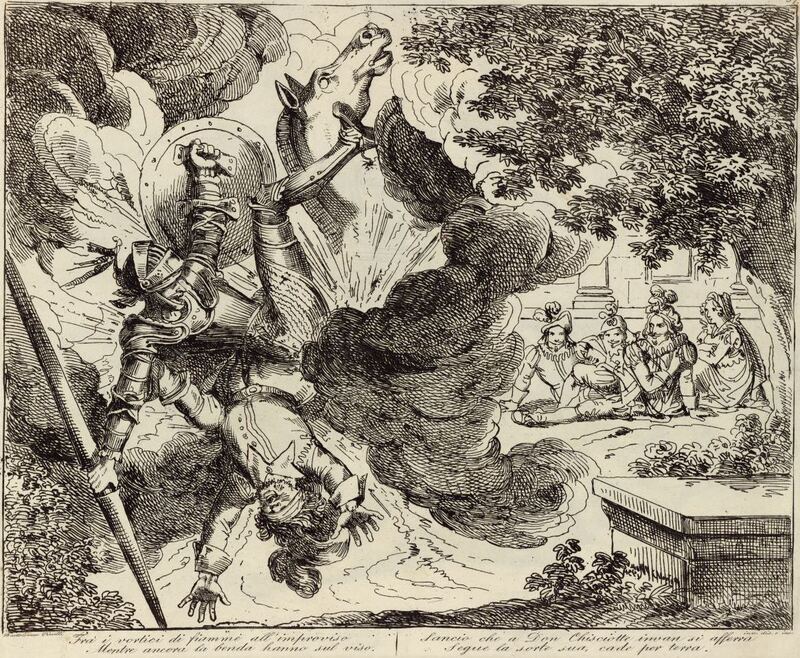The firecrackers inside Clavileño explode, throwing Don Quixote and Sancho Panza in the air. The duke, the duchess, and their servants (background) observe the scene. Signed by Bartolomeo Pinelli (engraver and illustrator) and dated Rome, 1833. Plate 57. Part 2, ch. 41.