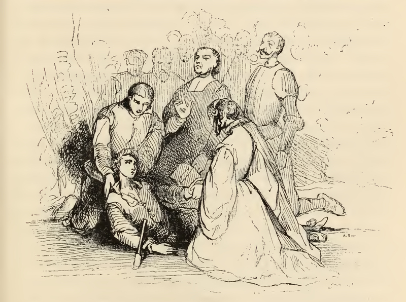 Having deceived all into thinking he has stabbed himself and subsequently asking for Quiteria's hand in marriage, Basilius (middle) lies on the ground and acts as if he is seized with a fainting fit. In the background all the by-standers act surprised, fearing that he is on the brink of death. Quiteria (right),dressed in her wedding attire, kneels next to Basilius and take his right hand in hers. A man with short hair holds Basilius' head upright, so that he might speak. A priest kneels over the priest with his right hand before his chest praying for Basilius' soul. On the right Don Quixote, clad in armor, kneels as well and looks off towards the left of the image.