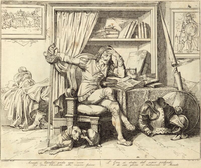 Don Quixote reads chivalric books in his study. He holds a sword and his lance and armour are scattered around him. His bed is pictured in the background. Also depicted are a dog, at Don Quixote’s feet, and a cat, amongst the books on his desk. Signed by Bartolomeo Pinelli (engraver and illustrator) and dated Rome, 1833. Plate 1. Part 1, ch. 1.