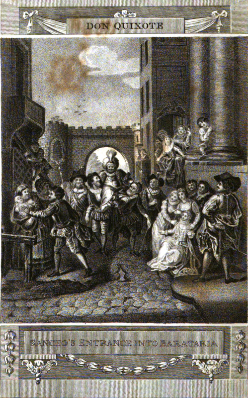 Sancho Panza sets out with a great number of followers towards the Barataria, the island which he is to govern. He is wearing a wide surtout coat and a murrey coloured camlet, with a cap. At his arrival in the walled town,, the magistrates, in their robes of office, came out to receive him and carry him to the church along a cobbled road. As they proceed bells ring, and the thousand inhabitants of the city give their demonstrations of joy at their governor's arrival.