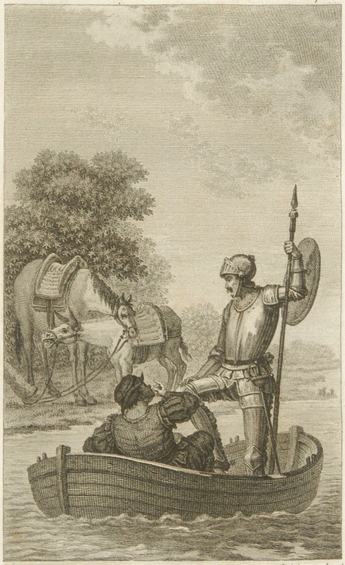 Don Quixote and Sancho Panza get into a boat on the Ebro River, leaving Rocinante and Sancho’s donkey braying on the riverbank. The boat lacks oars. Signed by J. Rivelles (illustrator) and A. Blanco y Asensio (engraver). Part 2, ch. 29.
