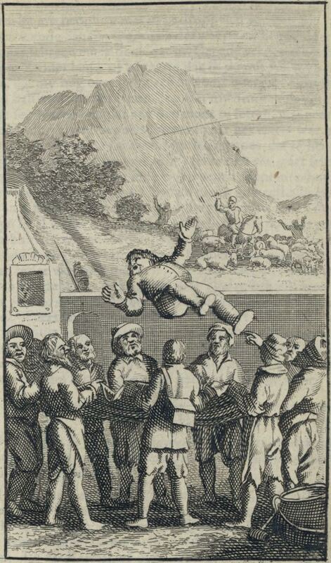 In order to punish Sancho Panza and Don Quixote for refusing to pay for their time at the inn, several of the other guests at the inn begin to blanket Sancho, tossing him into the air with a blanket. Seeing this, Don Quixote yells insults over the wall at them, but to no avail. Don Quixote can be seen attempting unsuccessfully to climb the wall from Rocinante’s back while Sancho Panza flies in the air above the wall. This scene can be found in Part I, Book 3 Chapter 3.