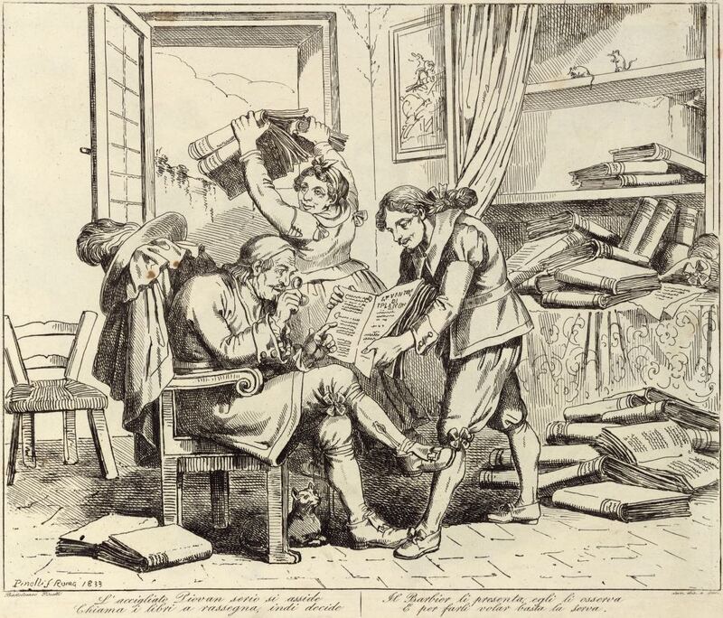 The housekeeper, the priest, and the scrutinise the books in Don Quixote’s library, later deciding to burn them for their responsibility in Don Quixote’s madness. The barber holds a chivalric book open while the priest reads. The housekeeper throws books out the window into the courtyard. Signed by Bartolomeo Pinelli (engraver and illustrator) and dated Rome, 1833. Plate 11. Part 1, ch. 6.