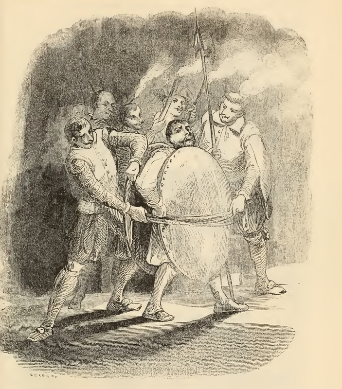 Having been warned of an invading army against the city of Barataria, the servants of governor Sancho bring him two huge shields and tie them over his shirt with rope, insomuch that he remained walled and boarded up straight like a spindle without being able to bend his knees or walk one single step. They also put a halberd into his hand to lean upon to keep himself on his feet. The servants carry torches and look at Sancho with bemusement while Sancho's face is plastered with a look of absolute terror.