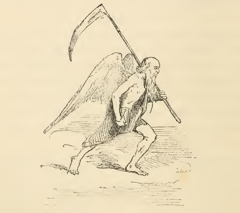 A winged old man with a long grey beard walks over a cloud dressed in rags. His wings are white, feathered, and angelic, in his right hand he carries a book and over his left shoulder he carries a scythe.