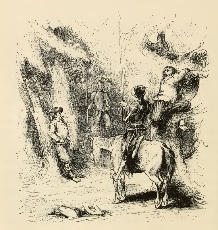Sancho Panza (right), scared of the Squire of the Woods' nose (left) climbs atop a cork tree to get as far away from its horrible size. Don Quixote (foreground), clad in full armor is mounted upon Rocinante with a lance in his left hand. In the background, among the trees, the Knight of the Mirrors is mounted upon his a horse, equipped with his own lance, prepares to duel Quixote. A hat and a wineskin lie on the ground near Rocinante's feet.