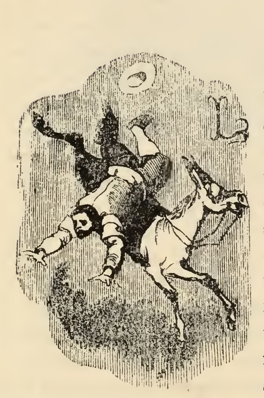 Don Quixote and Sancho Panza encounter a cart carrying the actors of Angulo el Malo’s company for the mystery play ‘The Assembly of Death.’ The latter are dressed as Devil, Cupid, Death, Angel, Emperor, Queen, and Soldier. Rocinante is alarmed by the sound of bells and runs across the field. While Sancho runs to Don Quixote’s assistance (foreground), a member of the company makes off with his donkey. Signed by A. Rodríguez (illustrator) and M. Albuerne (engraver). Part 2, ch. 11.