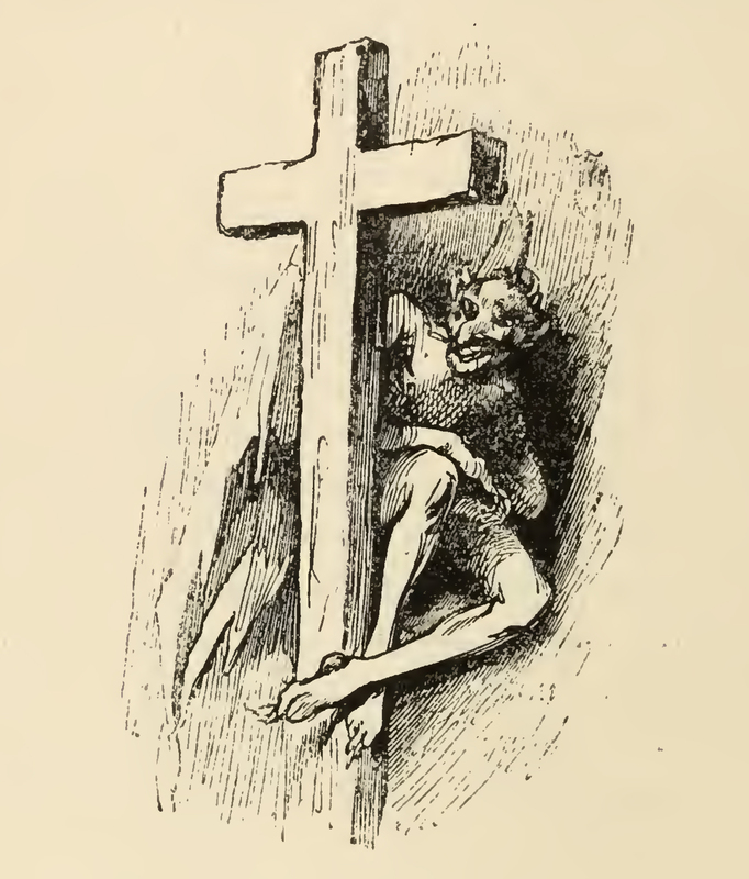 A moustachioed bald man with short horns and angelic wings hides behind a wooden cross, peaking out from behind the shadow, his feet dangling by the base. The image is occasioned by Quixote saying "I have heard say that the devil lurks behind the cross, and all is not gold that glitters".
