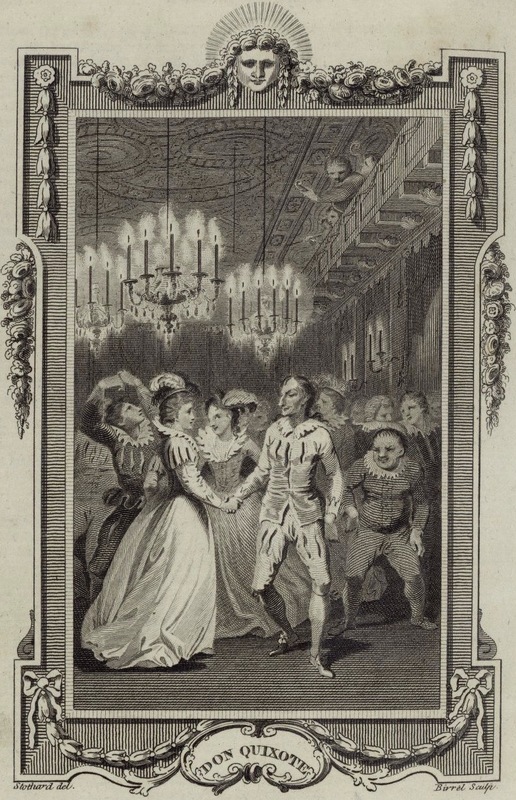 At the soirée, Don Quixote dances with Don Antonio Moreno’s wife and some of her friends. Signed by T. Stothard (illustrator) and O. Birrel (engraver). Plate X. Part 2, ch. 62.