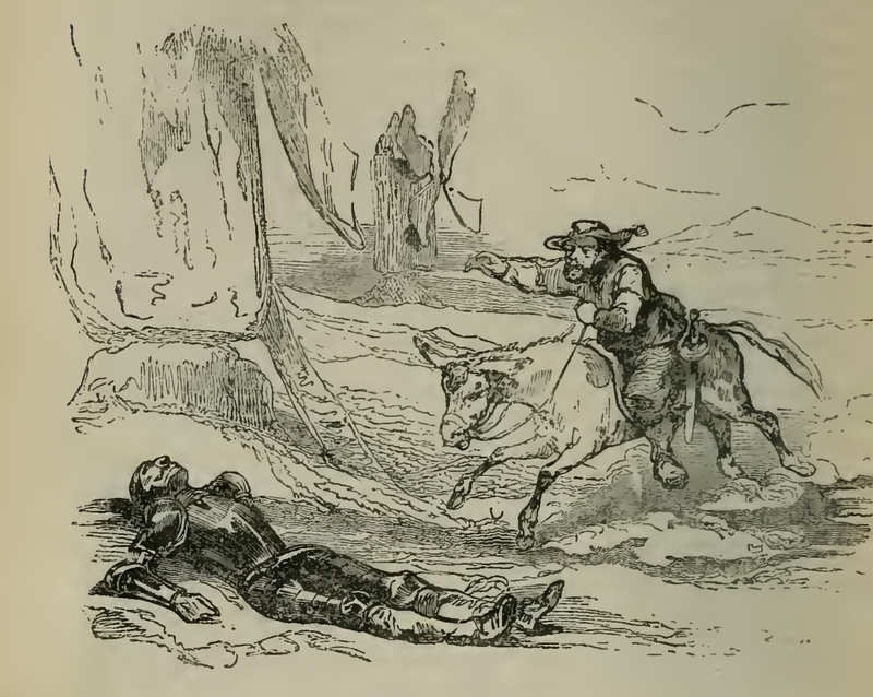 Don Quixote (clad in armor) mistakes windmills for giants and speeds upon the first windmill he could come at, breaking his lance into pieces, and being hurled away to the ground. Sancho Panza ran as fast as his ass could drive to help his master, whom he found lying, and not able to stir.