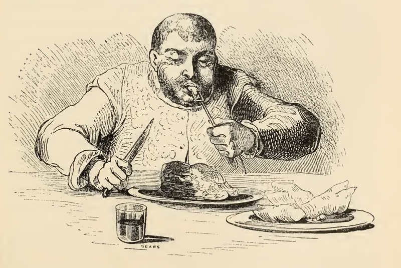 During his governorship of Barataria, Sancho Panza is led to a sumptuous palace in the great hall where a royal table was elegantly furnished. when the governor entered, and four pages came forth. Sancho took his place at the upper end of the table that was accommodated for one. To his left stood a physician with a rod of whalebone in his hand. A great variety of dishes were brought forward for Sancho and a page tucked a laced bib under Sancho's chin. Sancho was only able to taste one morsel when the doctor touched the plate with his wand, and it was taken away by a page. Another dish was presented, but this was touched by the wand just as quickly and another page took the dish away with incredible speed. The three pages in the foreground are young boys taking Sancho's dishes away after being given the signal by the whalebone wand of the physician (pictured to the right with a long white beard), who was enjoying this practical joke with all others who were in Sancho's presence.